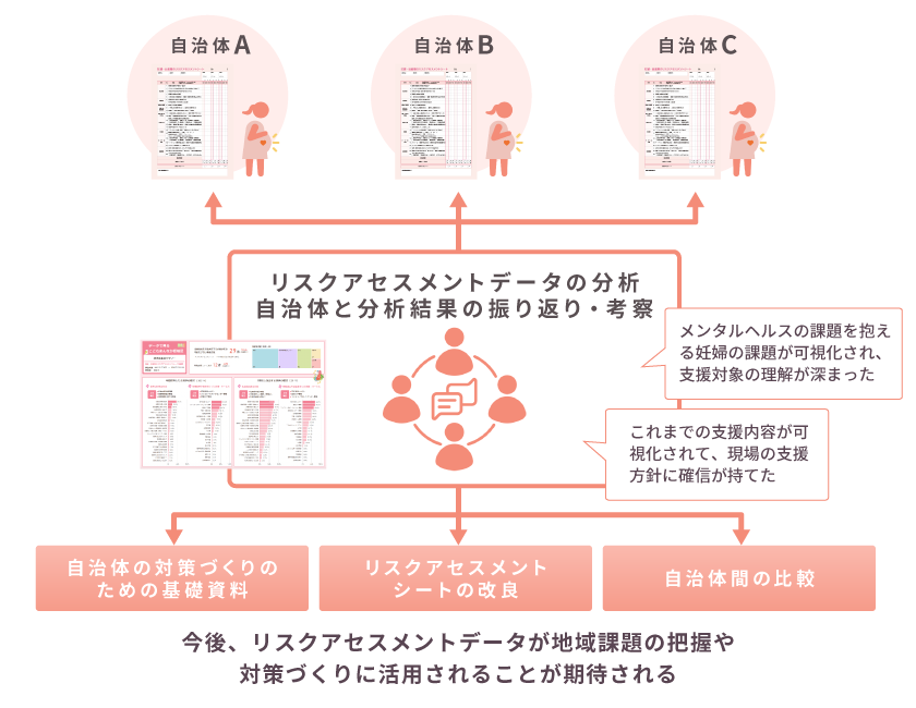 リスクアセスメントシートを導入するメリットとして、蓄積した情報のデータ利活用があります。私たちは、各自治体からお預かりしたデータを整理分析し、自治体に「どのような課題を抱える妊産婦さん(またはお子さん)が多いのか」といったことを視覚的に示してお返ししています。自治体と研究者で、分析結果について振り返り、個々のデータが合わさって見えてくる地域全体の課題について話し合っています。